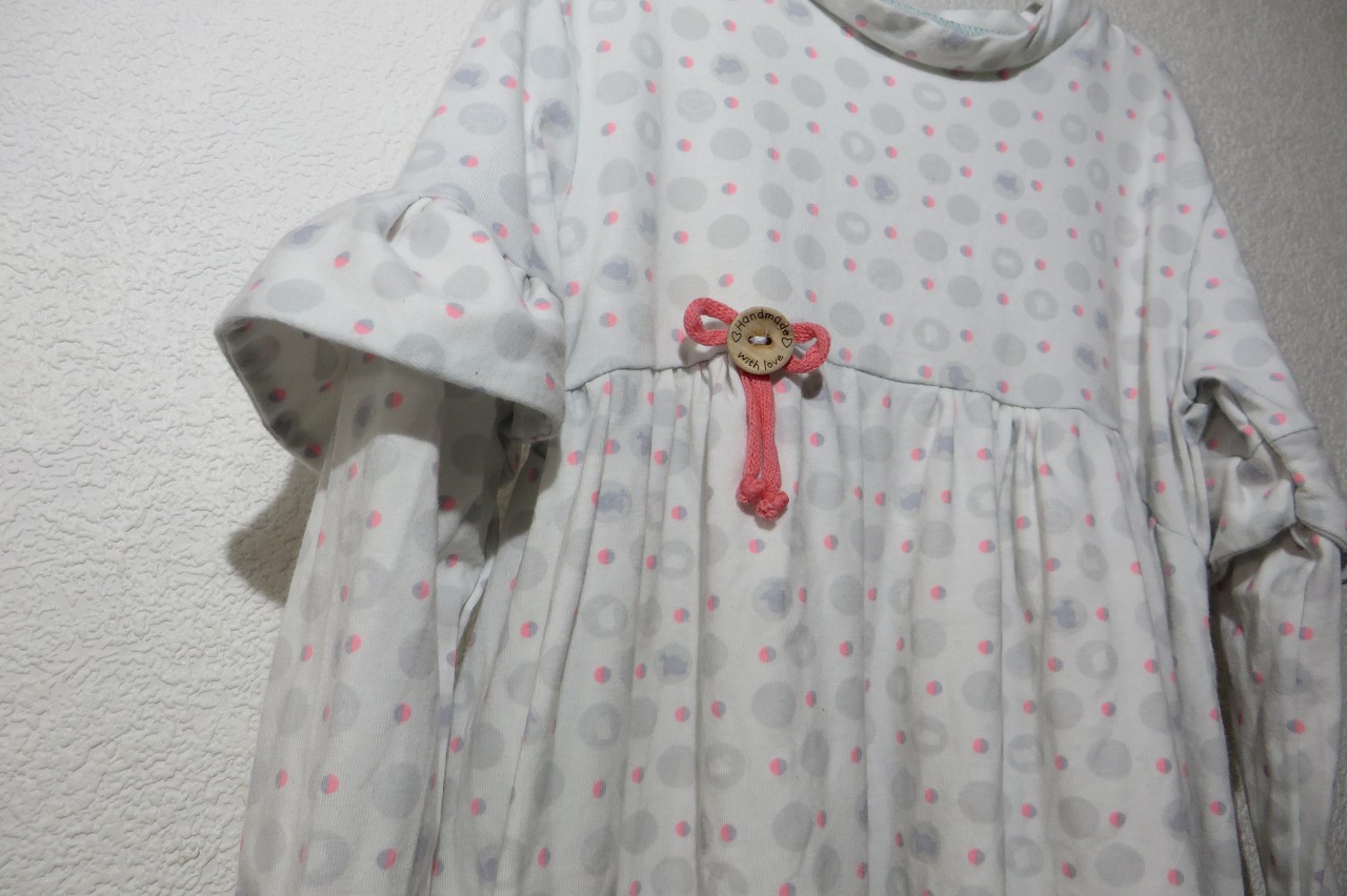 Schönes Kleid aus weißem Jersey mit Kreisen undVögelchen in Größe 110.